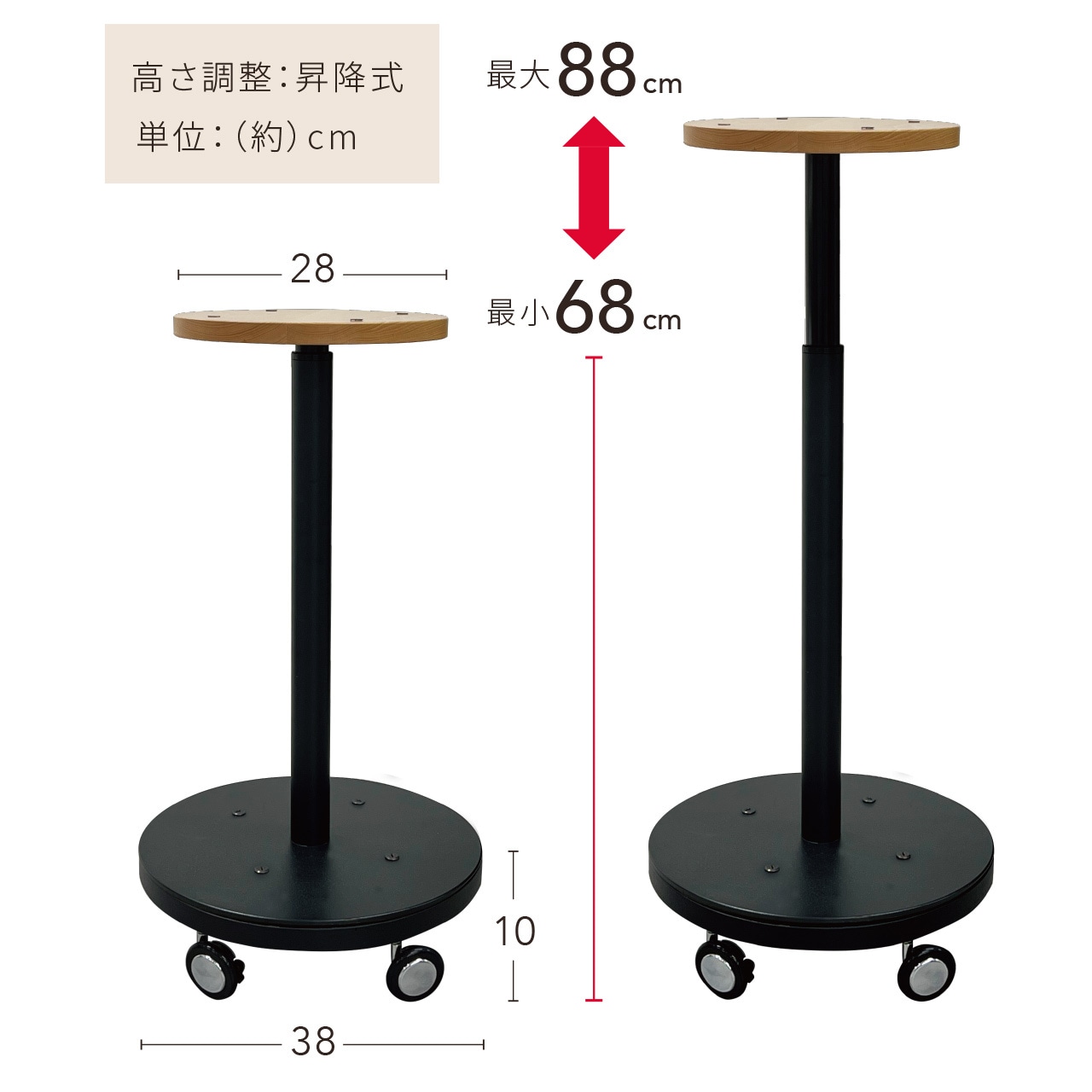 ・全高 約68 〜 88cm、脚底板とキャスターの高さ 約10cm
