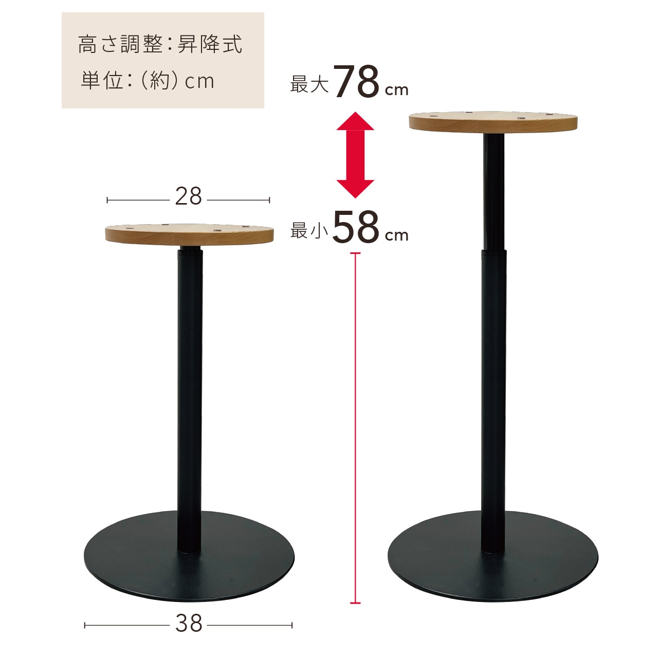 キャスターなし:高さ最大78cm 〜 最小58cm
