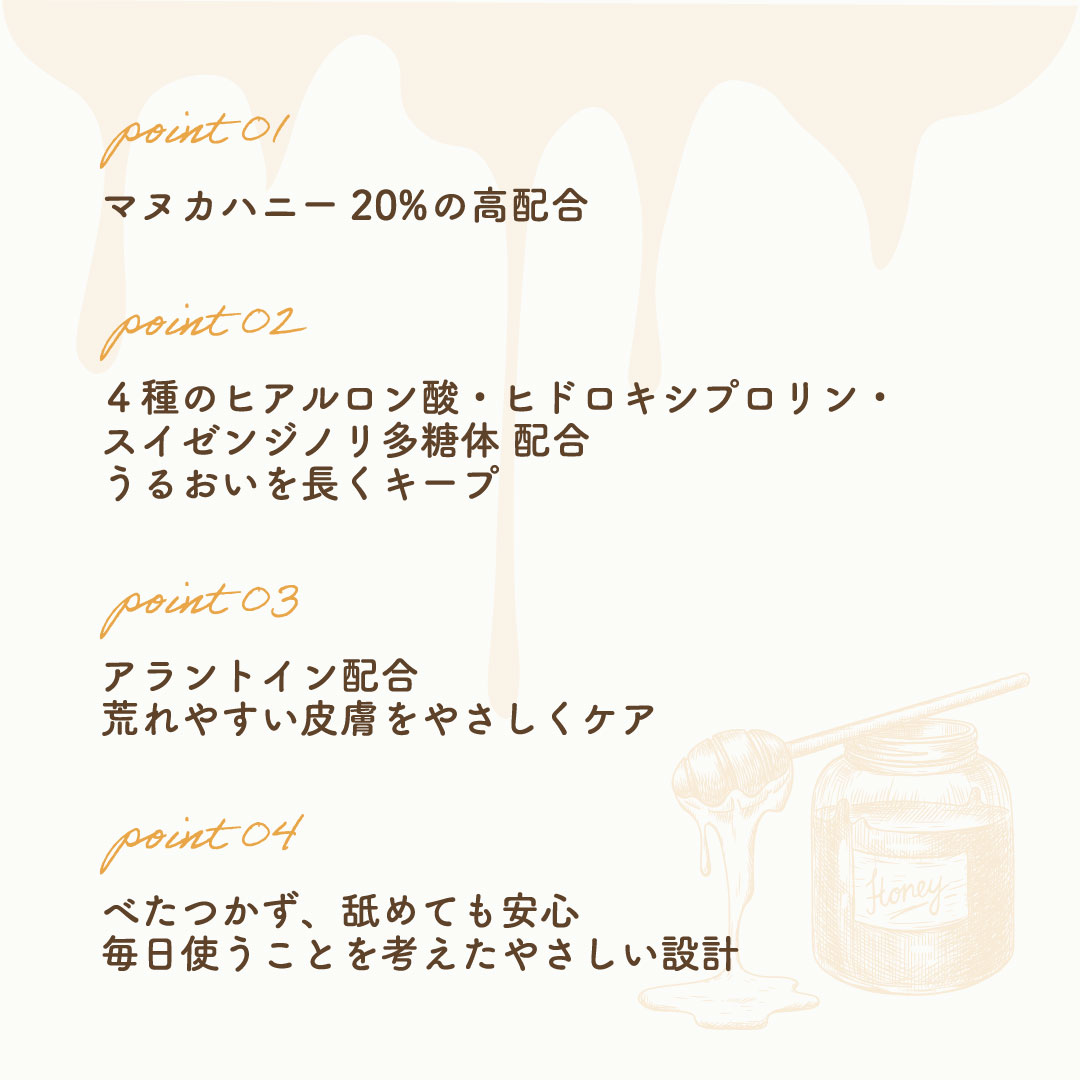 ●水、ハチミツ(マヌカハニー)、ヒマワリ種子油、水添ヤシ油、グリセリン、BG、ミツロウ、スクワラン、ステアリン酸グリセリル(SE)、セテアリルアルコール、ジステアリン酸ポリグリセリル-3メチルグルコース、ヒドロキシプロリン、α-グルカン、グルコシルセラミド、スイゼンジノリ多糖体、アラントイン、ポリクオタニウム-51、アセチルヒアルロン酸Na、ヒアルロン酸Na、ヒアルロン酸クロスポリマー-2-Na、加水分解ヒアルロン酸Na、トコフェロール、エチルヘキシルグリセリン、ペンチレングリコール、1,2-ヘキサンジオール、セテアリルグルコシド、フェノキシエタノール