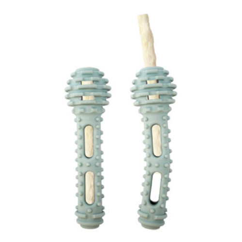 ●デンタルガムを穴に入れると曲がっていた本体が真っ直ぐになり、ガムが抜けにくくなるので、噛もうとして本体も一緒に噛むことにより長い時間噛み続けます。