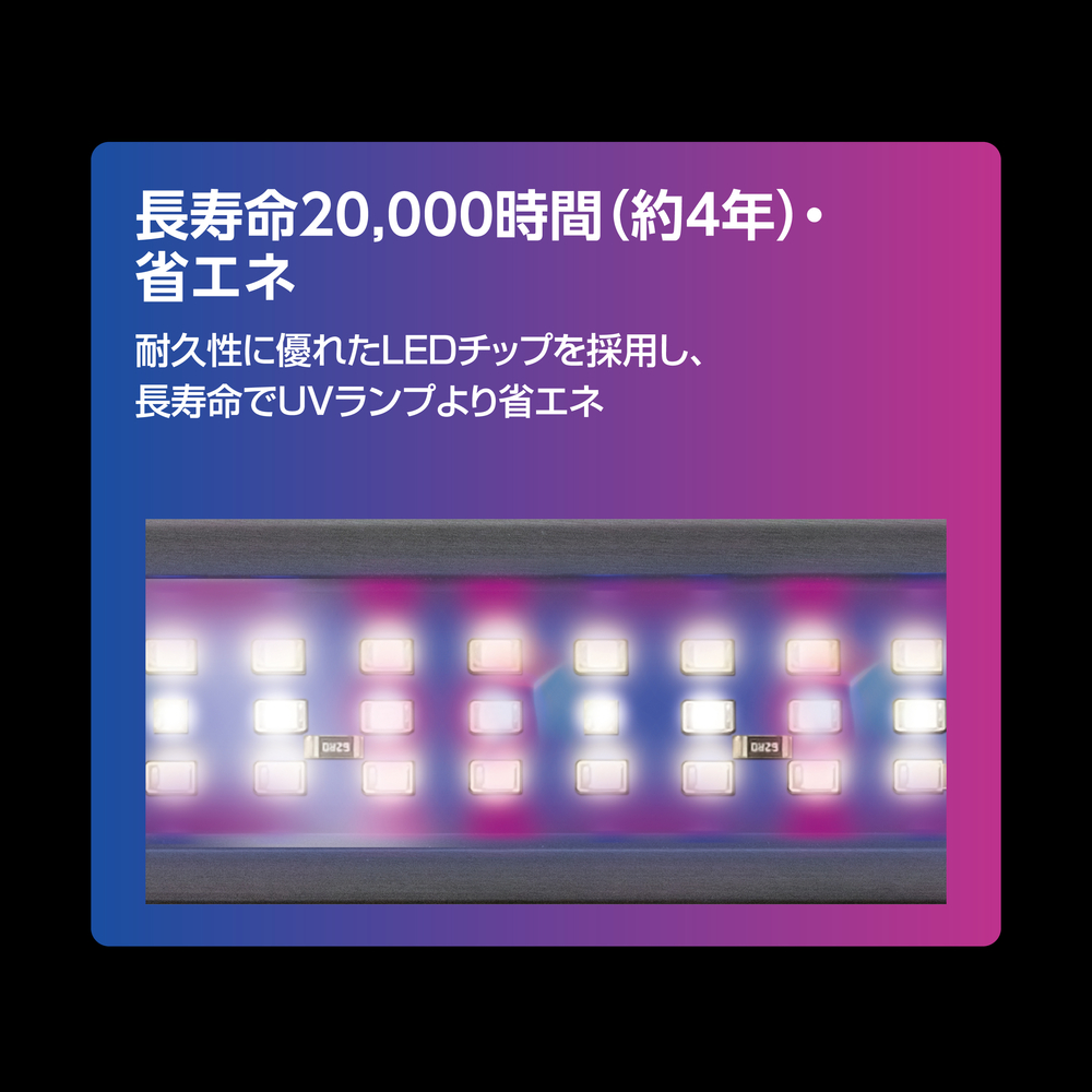 ●耐久性に優れたLEDチップを採用し、長寿命でUVランプより省エネ