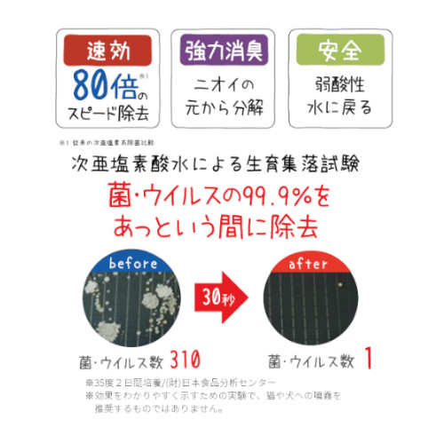 ●従来の塩素系除菌剤に比べて、80倍のスピードで菌・ウイルスを99.9%除去できるオールペット用の除菌・消臭剤の付替用。