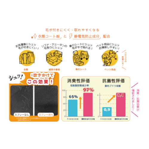 ●衣服、車の座席シート、絨毯やベットなどに満遍なく軽く湿る程度噴霧する事でペットの毛が付きにくく取れやすくなります。