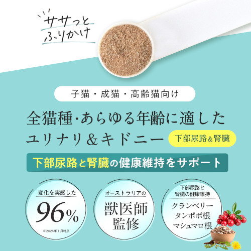 ●与えやすい粉末タイプで、毎日のごはんにふりかけるだけ。不要な添加物を最小限にし、植物油、大豆粉、保存料は含まず、愛猫の健康を維持する主要な成分だけが含まれています。