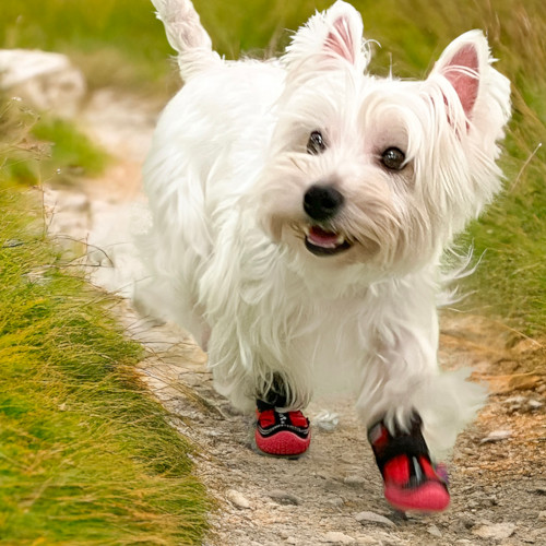 愛犬の足を入れ、面ファスナーを巻き付けるだけ。履かせやすく脱げにくいオールシーズン対応の犬用靴。