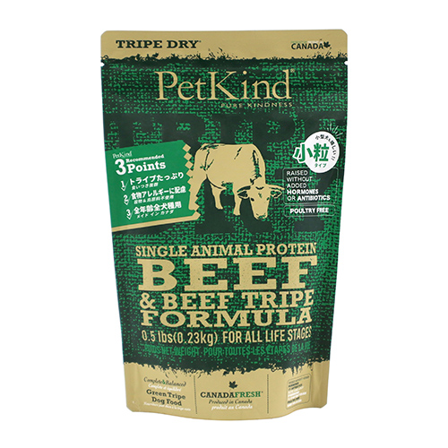 ビーフトライプ、牛肉、レンズ豆、エンドウ豆、エンドウ豆タンパク質、ひよこ豆、エンドウ豆澱粉、亜麻仁、キャノーラオイル(ローズマリー抽出物により酸化防止)、かぼちゃ、ほうれん草、にんじん、ブロッコリー、クランベリー、りんご、ブルーベリー、バナナ、サーモンオイル(ローズマリー抽出物により酸化防止)、ナチュラルフレーバー、亜鉛タンパク化合物、鉄タンパク化合物、銅タンパク化合物、マンガンタンパク化合物、ビタミンA、ビタミンD3、ビタミンB16、ビタミンE、ナイアシン、リボフラビン、硝酸チアミン、塩酸ピリドキシン、葉酸、酸化マンガン、ヨウ素カルシウム、亜セレン酸ナトリウム、タウリン、炭酸カルシウム、塩化ナトリウム、塩化カリウム、塩化コリン、乾燥ラクトバチルス・アシドフィラス発酵物、乾燥ラクトバチルス・カゼイ発酵物、乾燥ビフィズス菌ビフィダム・サーモフィラム発酵物、乾燥ストレプトコッカス・フェシウム発酵物、ユッカシジケラ、ローズマリー、トウガラシ、ペパーミント、タイム、緑茶エキス●生産国:カナダ
