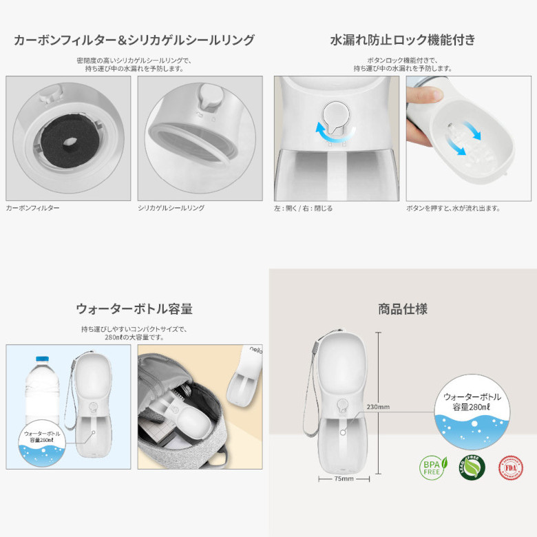 【特長】●ボタンロック機能付きで持ち運び中の水漏れを予防