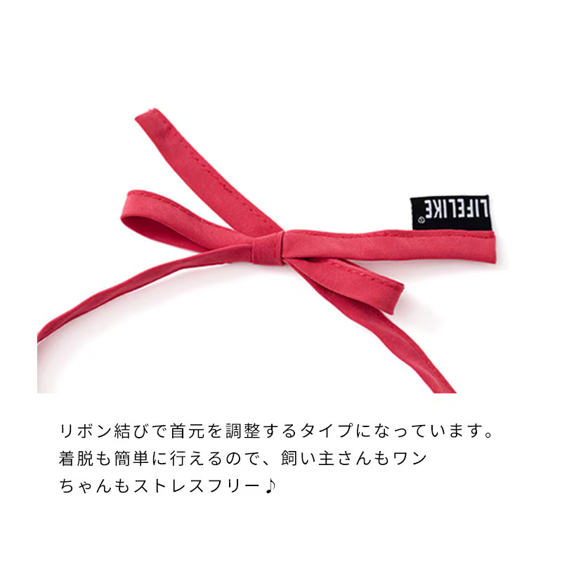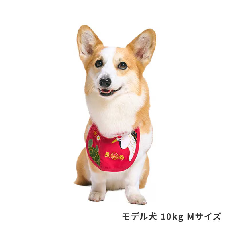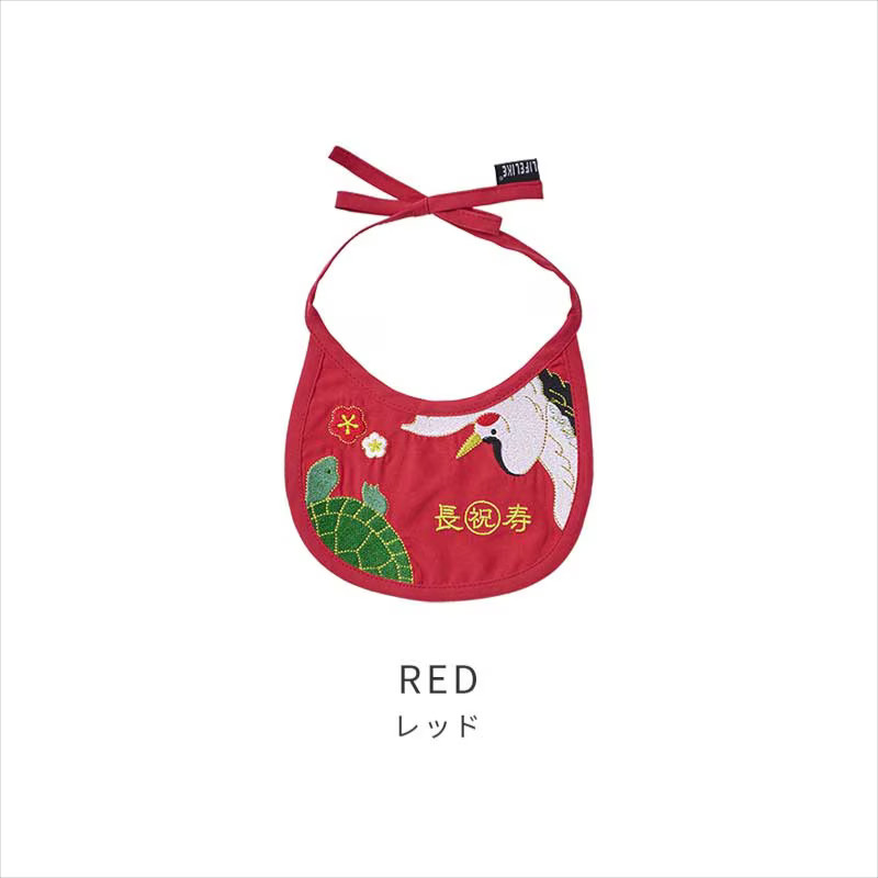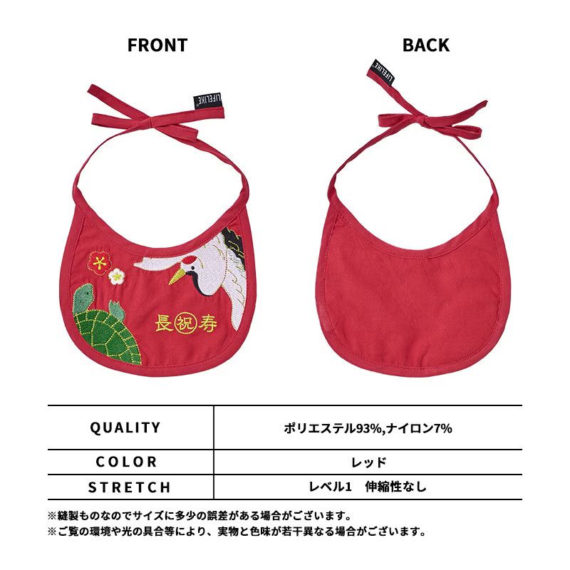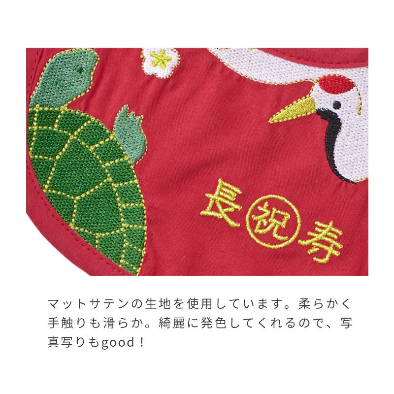 ●ポップな鶴と亀の刺繍デザインが華やかで、リボン結びで首元を調整し、着脱します。