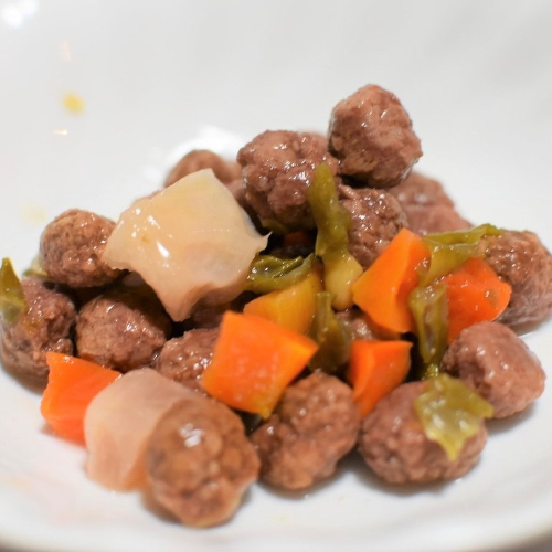 ●国産のいんげん、 人参、大根、 鹿肉ミートボールを一緒に美味しく低温調理しました。