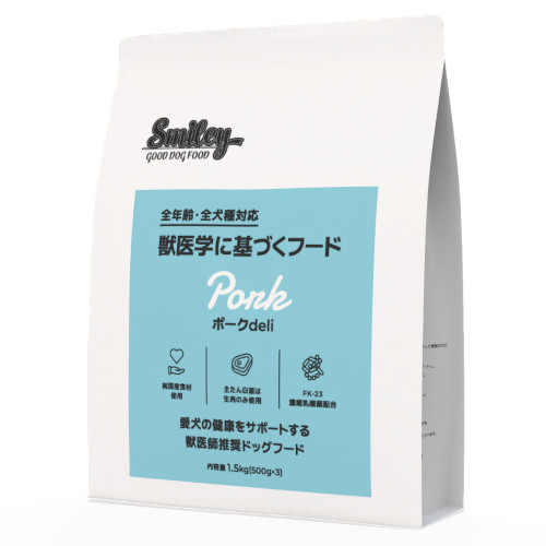 豊富なビタミンB1、不飽和脂肪酸(オレイン酸)、カルニチン、ナイアシンなど多くの栄養素を持つ豚生肉使用で愛犬の健康な体型、皮膚被毛の維持