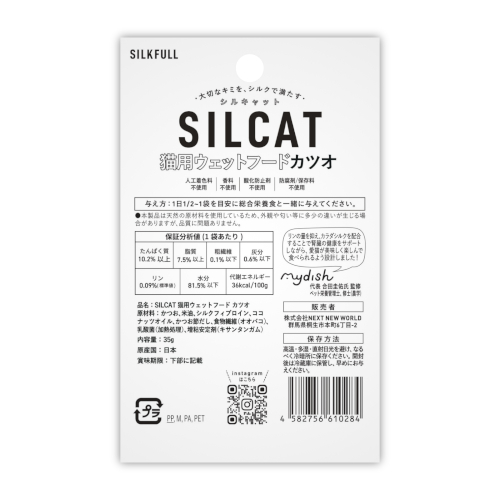【カツオ】かつお、米油、シルクフィブロイン、ココナッツオイル、かつお節だし、食物繊維(オオバコ)、乳酸菌(加熱処理)、増粘安定剤(キサンタンガム)